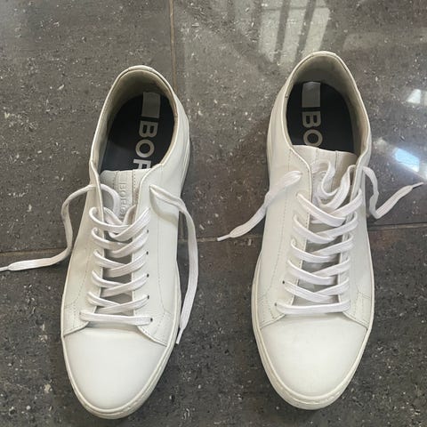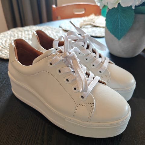 Stockholm Design Group sneakers/joggesko i størrelse 36. Modellen er hvit med platåsåle og har glatt overdel uten lisser, med elastisk parti over vristen. Detalj med slange-/skinnmønstret parti bak på hælen. Overdel og innersåle fremstår som skinn eller skinnimitasjon, og yttersålen er i gummi. Egnet som hverdagssko og fritidssko. Aldri vært brukt og det der du bla på sålen under. Koster 1999 kr ny,men selges for 1000kr,pris kan diskuteres ved snarlig avgjørelse. Foretrekker vipps,men sender i posten mot porto. Pleier å sende norgespakke