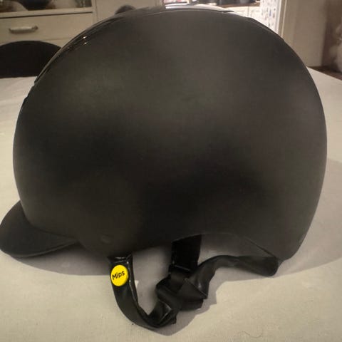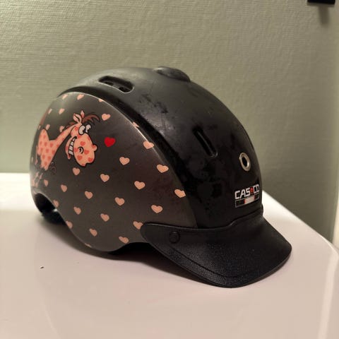 Pocito ridehjelm for barn i svart farge med enhjørningmotiv og stjerner på sidene. Hjelmen har flere ventilasjonshull på toppen for lufting og justerbar hakereim med klips. Innvendig polstring for økt komfort. Kun brukt et par ganger. Str. Small.