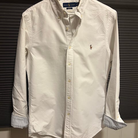 Kul Ralph Lauren Polo skjorte for herre i slimfit størrelse Large. Skjorten er hvit og laget av bomull. Skjorta har klassisk krage. Den har lange ermer med mansjetter og brodert Polo-logo på brystet. Passer til alle anledninger