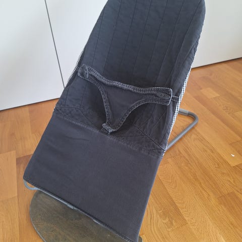 Babybjörn barnestol/vippestol med trekk i leopardmønster. Stolen har sort ramme og justerbar sittestilling.