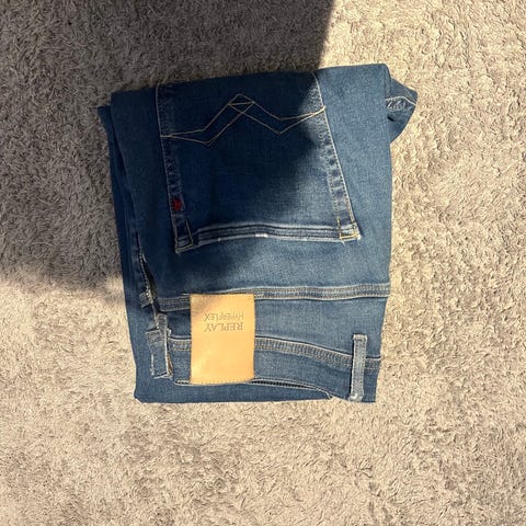 Replay Grover jeans for herre i blå denim. Buksen har straight fit passform og er i størrelse W31 med lengde 34. Klassisk 5-lommers modell med glidelås og knapp i front, beltehemper i linningen og skinnpatch med Replay-logo bak. Materiale i denim (bomull). Brukt en håndfull ganger.