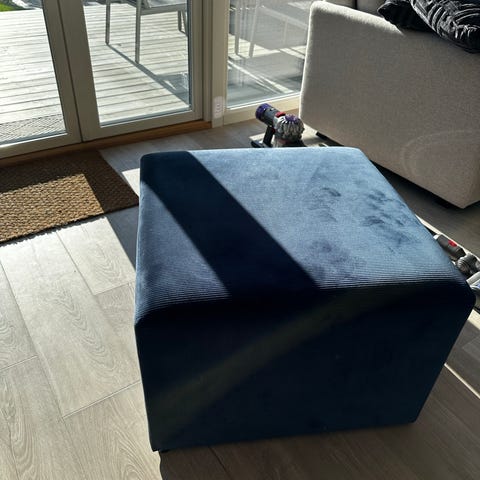 2 stykk puffer med oppbervaring under. Jeg hentet dem uten trekk og forsøkte å sy trekk med veluer. Det ble helt ok. Gis bort mot henting.
