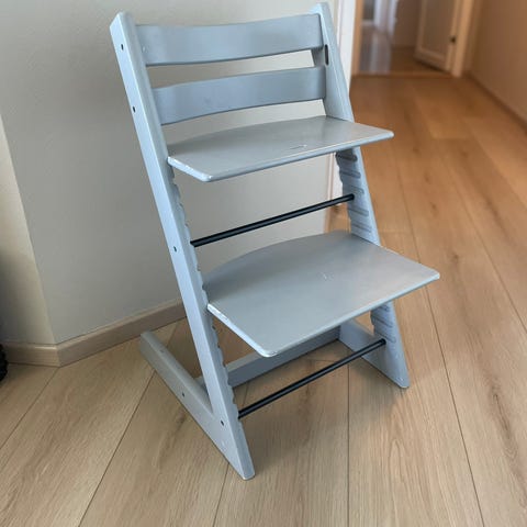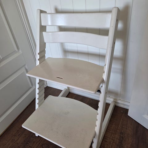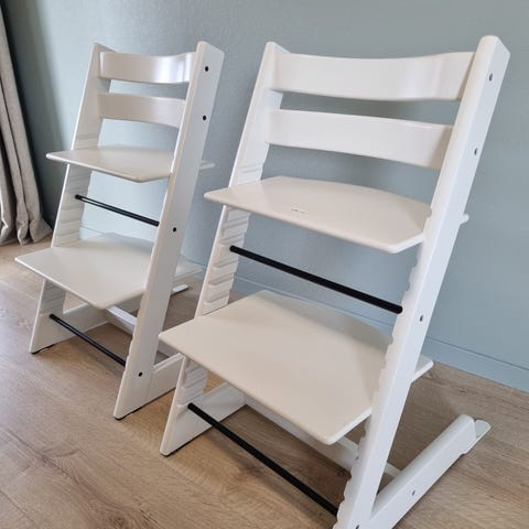 Stokke høy barnestol i hvit farge. Stolen har justerbar sitteplate og fotbrett som kan tilpasses barnets høyde. Egnet som spise- og sitteplass ved bord for barn. Laget i solid materiale med tverrstang under sitteplaten for ekstra stabilitet.