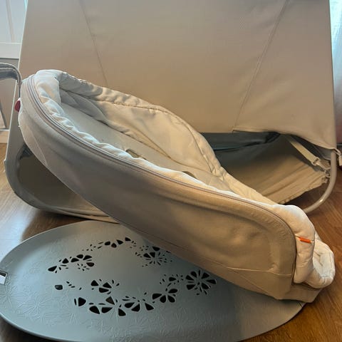 Stellebord i plast, i beige farge. Stellebordet har integrerte oppbevaringsrom på sidene og en polstret stellematte i lys farge. Kan også plasseres på badekar