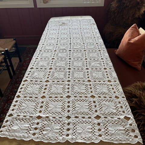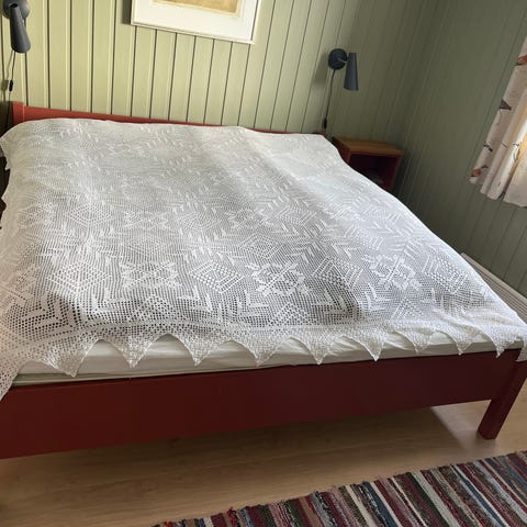 Tror de ble heklet på 50-60 tallet for bruk i pensjonat senger - som den gang bare var 190/195 cm.