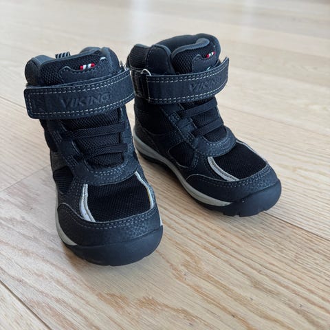 Viking barnesko i størrelse 29. Svarte med grå detaljer. Pent brukt med unntak av litt rusk på den delen av borrelåsen som ikke er i bruk. Gode og lette vintersko med Goretex.