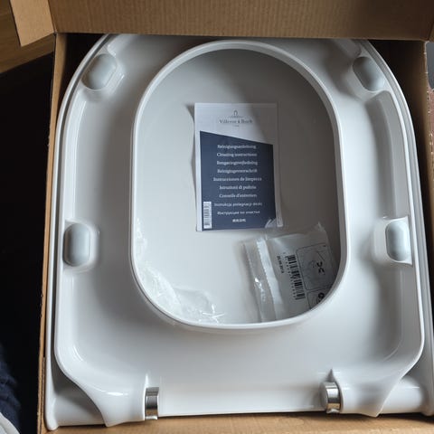 Esken er åpnet og plastikken på setet er åpnet, men monteringsdeler ligger i uåpnet pakke.