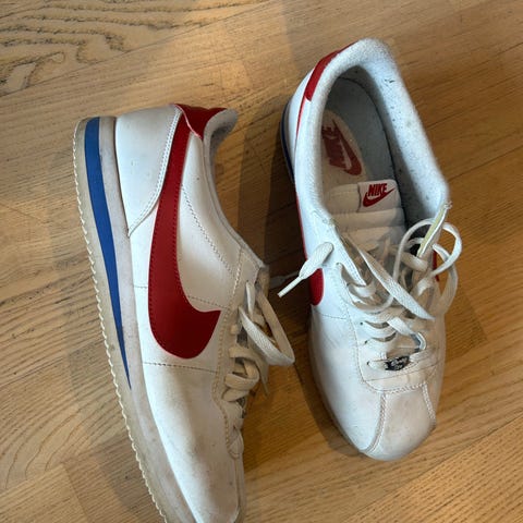 Nike sneakers joggesko i størrelse 44. Modellen har blå overdel i pustende tekstil med snøring foran og hvit såle med mønster for grep. Passer til hverdagsbruk og lett trening.