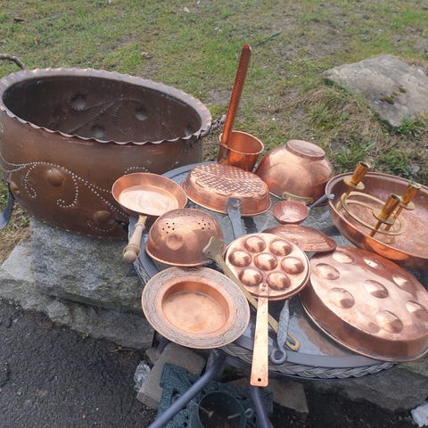 Kobber kjøkkenutstyr sett bestående av flere deler. Settet inkluderer blant annet vannkjele, kjele, sil og mugge i kobber. Passer til bruk på kjøkken eller som dekorative elementer. Materialet er kobber, som gir et tradisjonelt uttrykk. Flere ulike størrelser på delene i settet.ønsker bud