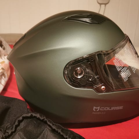 HJC C10 MC-hjelm i størrelse S (55–56 cm). Helhjelm med klart visir, antidugg og hurtigspenne på hakestroppen. Godkjent etter ECE R22.06-standarden. Hjelmen har feste og montert Cardo-enhet for intercom/kommunikasjon. Egnet til motorsykkelbruk med helhjelmkrav.