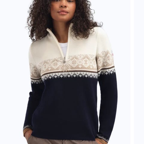 Dale of Norway genser for dame i størrelse L. Genseren er lyseblå med hvite mønsterdetaljer. Laget av 100 % ull. Har høy hals med kort glidelås. Tynn og behagelig ull. Ikke spesielt stor i størrelsen (passer deg som bruker damestr. 38-40)