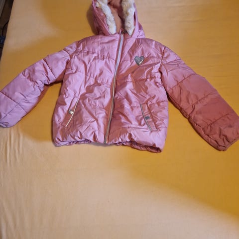 Rosa jakke til jente i størrelse 122 ( 6-7 år)med matchende votter Marc and Spencer. Jakken har hel glidelås foran og hette med fôr. Den er vattert og har sløyfemønster over hele. Vottene har samme farge og mønster som jakken. Passer til hverdagsbruk i kjøligere vær.