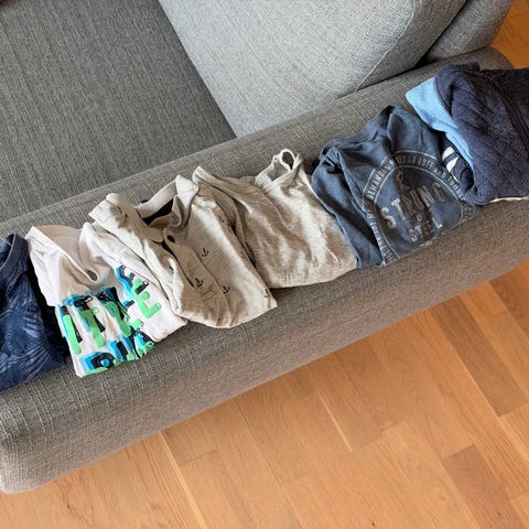 6 skjorter, hvorav 2 kortermet. Et sett m/shorts. Str 86-92, alle er brukt i samme periode