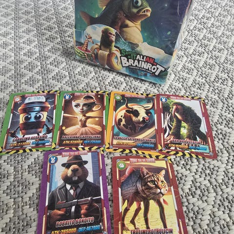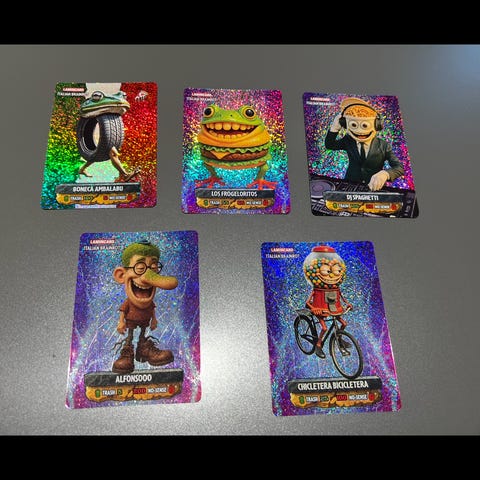 (4)Samlekort Los Tralalitos Tralala med ulike figurer og motiver. Kortene har illustrerte karakterer med navn og ATK/DEF-verdier trykket på forsiden. Egner seg til samling, bytting eller som spillkort for barn og samlere. Kortene selges samlet.
