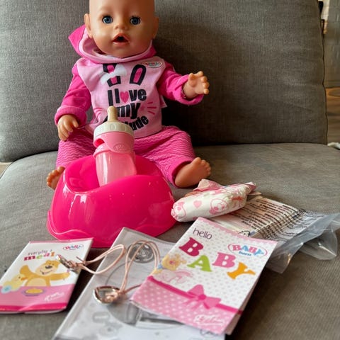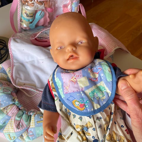 Baby born dokke godt brukt selges med potte klær og bæreveske. Kan bevege henda og bein, og hvis man gir vann kan den tisse, flaske skål hatt og en veske for å ha tingene i er med