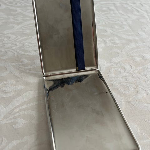 Metall sigarettetui med stripet dekor på utsiden. Etuiet åpnes som en bok og har strikker på begge sider for å holde sigarettene på plass. Passer til oppbevaring og transport av sigaretter eller lignende små gjenstander.