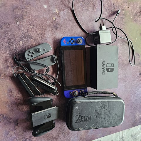 Nintendo Switch spillkonsoll med dokkingstasjon og tilbehør.