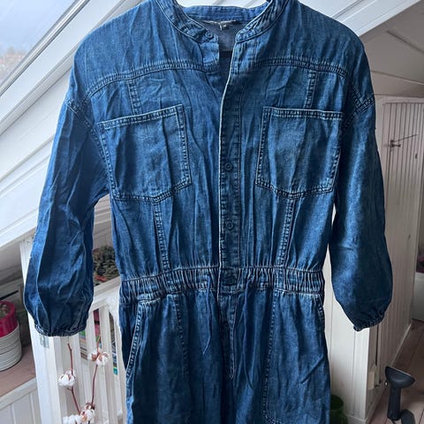 Gestuz denim jumpsuit i blå. Modellen har kort erm med lett puff, krage og glidelås i front. Det følger med avtagbart belte i samme materiale for justering i midjen. Jumpsuiten har rette, lange ben og sidelommer. Str 40. Lite brukt så fremstår som ny.