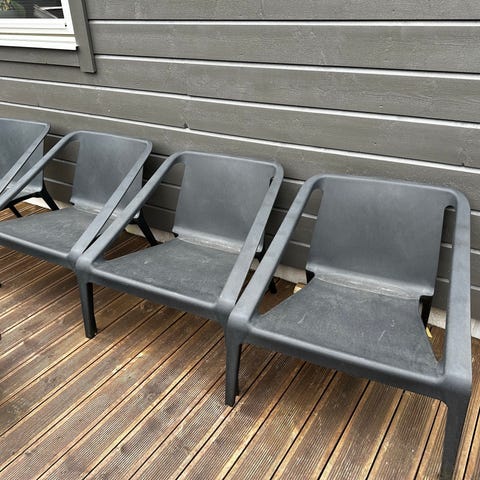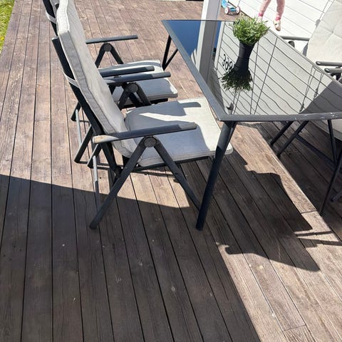 Møblene er egnet for bruk på balkong, terrasse eller i hage, og kan enkelt foldes sammen for lagring når de ikke er i bruk.