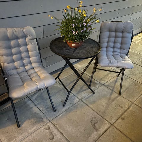 Må henter i dag fredag 13/3 innen kl 1400. Sammenleggbart caféssett med rundt hagebord og tre stoler i grått metall og tekstil.