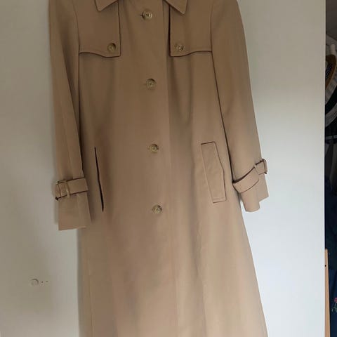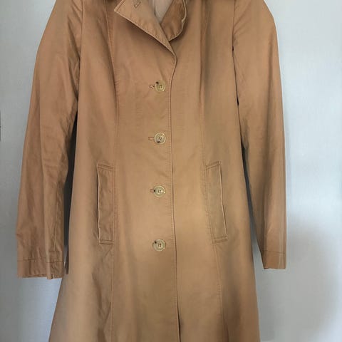 Søt trenchcoat selges rimelig da den har en knekt knapp og noen merker som jeg er usikker på om går av i vask. Den er kjøpt brukt tidligere.