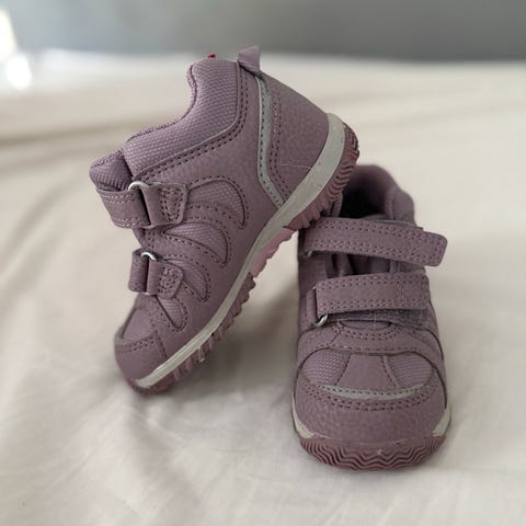 Viking barnesko i størrelse 23. Skoene har borrelåslukking med tre stropper og overdel i tekstil og syntetisk materiale i lilla tone. Sålen er lys og gir godt grep