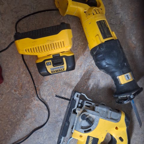 Serger en DeWALT DW333KT 701W stikksag med koffert og HiKOKI, BOSCH stikksagblad 8stk.