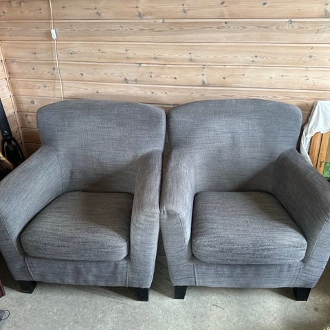 Solide regulerbare lenestoler med puffer fra Hjellegjerde. Fungerer som de skal, men med synlig slitasje i trekket. Stolene kan få nytt liv med nytt trekk. Gis bort ved henting.