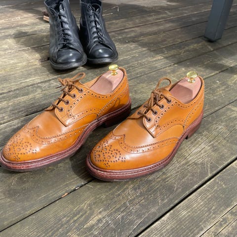En godbit fra samlingen her: Et par country brogues Grenson lagde i samarbeid med Barbour for en del år tilbake. Lagd i Grensons fabrikk i Northamptonshire i en blanding av skinn og oilskin (waxed cotton). Et par genuint annerledes sko. Dette paret brukte jeg en del da de var nye, men sålen var blitt hard over tid, så de har vært en runde tilbake hos Grenson for en full rebuild. Dette innebærer at kun oversiden er tilbake av det originale. De er nullstilt med ny commando-såle, innersåler og lisser. Kun litt av den attraktive Barbour-patinaen gjenstår. Grenson Rebuild kostet noe over 3000 med alt.