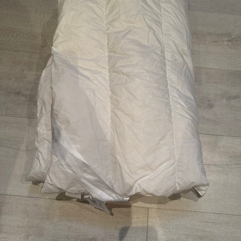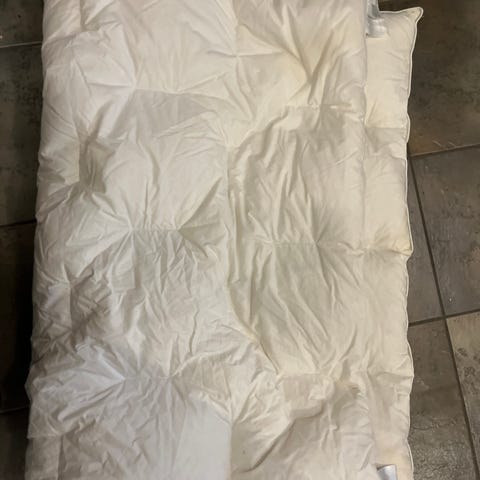 Kid dyne for barn i hvit farge. Dynen har vattert rutemønster som holder fyllet jevnt fordelt. Passer til bruk i barneseng eller barnevogn. 100x140. Myk barnedyne til helårsbruk etter behov. Dynen er vasket. Det er en flekk (se bilder) men denne er ikke forsøkt vasket bort med sterkere midler.