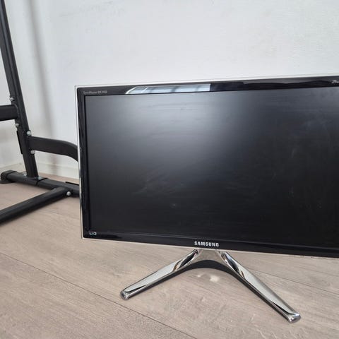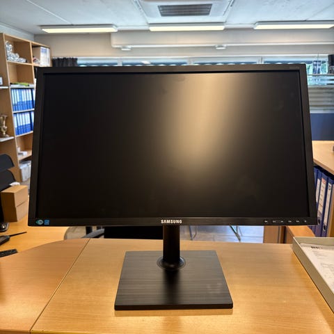 Samsung S24F350 skjerm med 24 tommers skjermstørrelse i svart utførelse. Skjermen har tynn ramme og slankt design, egnet for bruk på skrivebord. På baksiden finnes tilkoblinger som blant annet HDMI og VGA, samt strømtilkobling. Skjermen står på en stabil fot som følger med. Passer til vanlig PC-bruk som kontorarbeid, nettlesing og enkel multimedia.