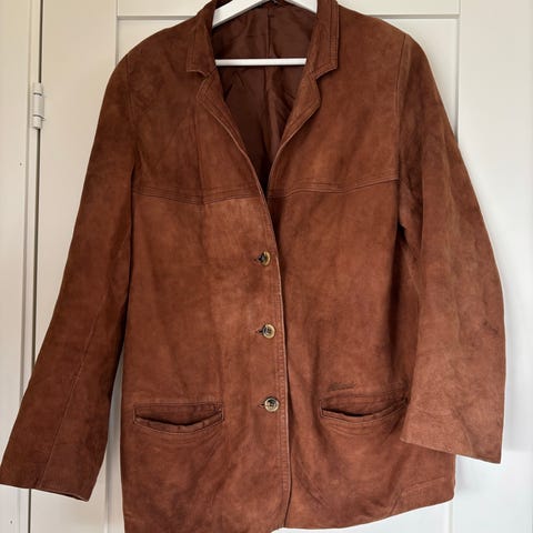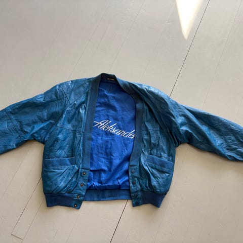 Skikkelig kul vintage skinnjakke. Mangler en knapp eller to men jeg har bare brukt den åpen. Vil si den er en large, så oversized til meg som er vanligvis en s/m.