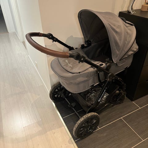 Det følger med babybag, 2 stk. regntrekk og myggnetting.