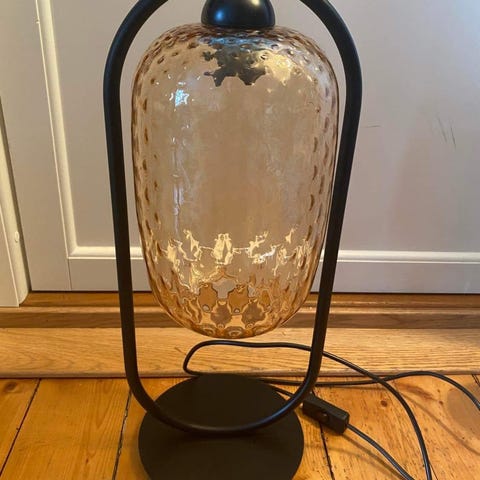 Bordlampe i brunt tre og glass. Særpreget design. Stilig med klar lyspære. Må nok hentes - evt kan den leveres mellom Stavanger og Bergen.