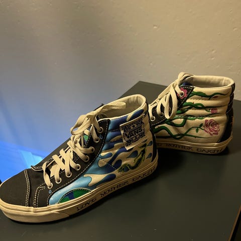 Vans joggesko i størrelse 39. Skoene er svart med hvite detaljer og hvite lisser. Unisex-modell som passer til hverdagsbruk. Overdel i tekstil og syntetisk materiale, med gummisåle. Europeisk størrelse 39 tilsvarer ca. 25 cm innvendig lengde ifølge merkelappen.