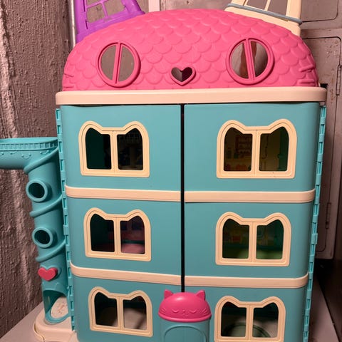 Godt men pent brukt lekehus fra Gabby’s Dollhouse. Litt brukt spor her og der, blant annet et litt sliten tre på toppen av heisen og et magisk teppe i første etasje.