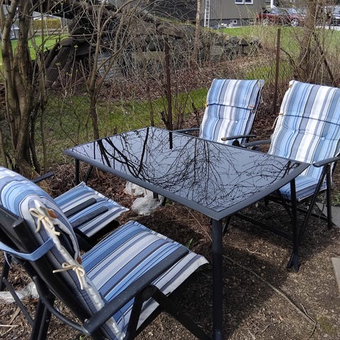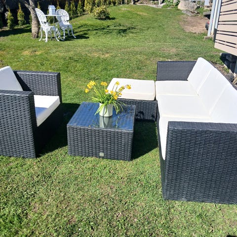 Ute lounge sofagruppe i 5 deler, hvor en del er glassbord med tykt solid glass. Laget med stålramme og værbestandig PE-rotting. Pent brukt og helt. Puter følger med: putene er hele, men noen er falmet. Stoff som kan tørkes av.