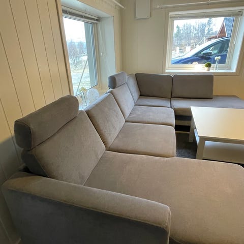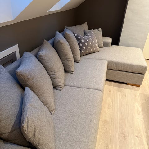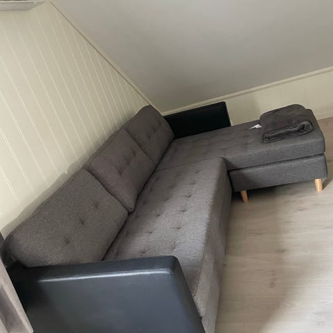 Selger en grå sofa med sjeselong