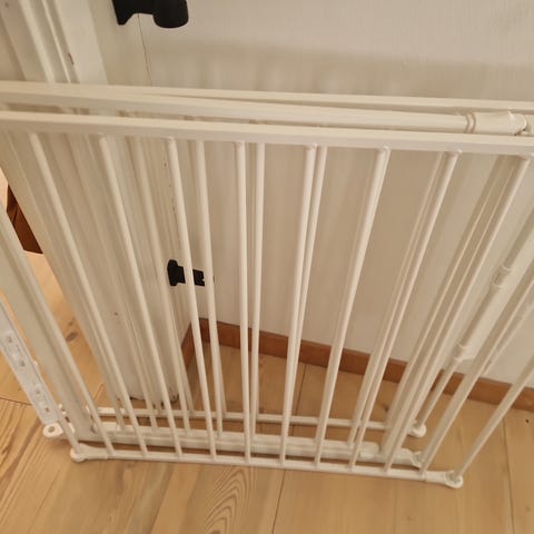 Praktisk trappegrind som foldes sammen når den er åpen. Dekker åpninger opp til 89 cm.
