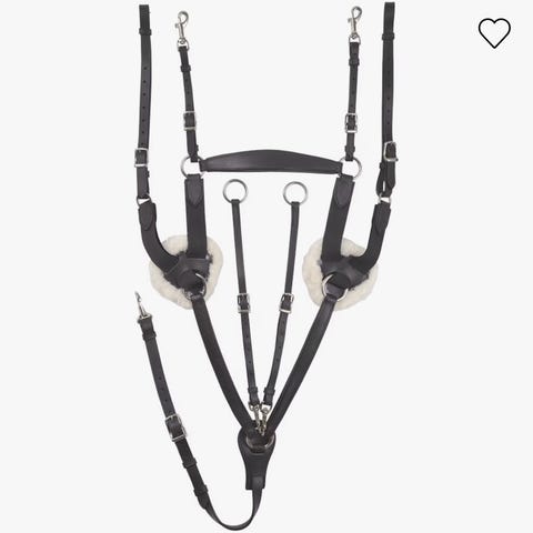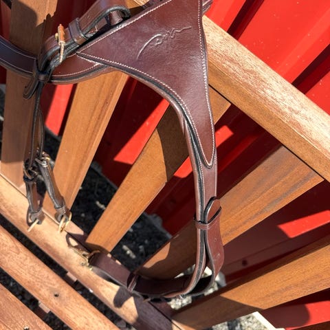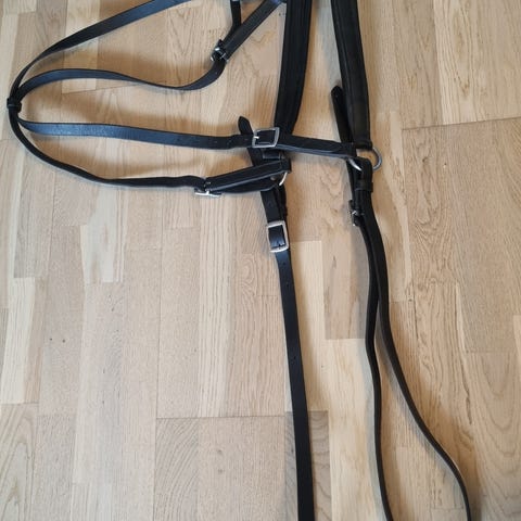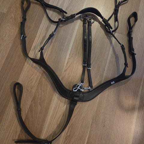 Størrelse full. Pent brukt men det er et lite hakk i ene stroppen til martingel. Farge mørk brun.