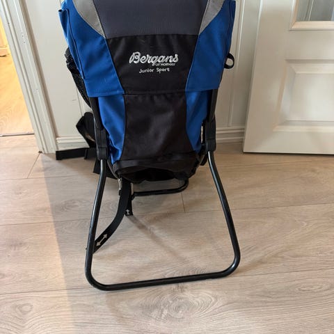 Bergans bæremeis for barn i rød farge med mørkeblå detaljer. Bæremeisen har polstret sete og rygg for barnet, justerbare seler og sikkerhetsstropper. Voksenbæreren har polstret hoftebelte og skulderstropper, samt justerbare remmer for bedre tilpasning og vektfordeling. Integrert støttebøyle gjør at bæremeisen kan stå støtt på gulvet ved inn- og utstigning. Egnet til tur og hverdagsbruk der barnet bæres på ryggen.