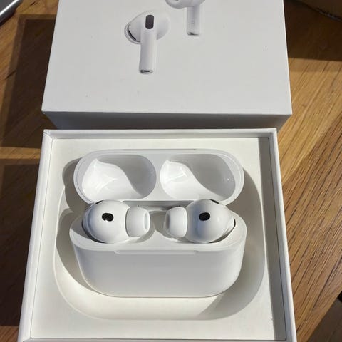 Apple AirPods Pro trådløst headset i hvit farge. Modellen leveres med ladeetui og Lightning‑til‑USB‑C ladekabel, som vist på bildene.