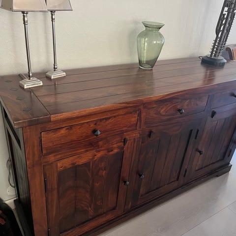 Skjenken har 3 skap med hylle i, dobbel+enkel skuff.