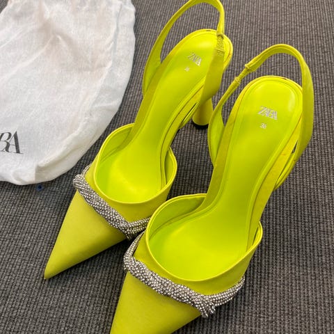 Selger et par stilige høyhælte sko fra Zara i en trendy neon grønn / lime farge. Skoene har en elegant spiss front og en dekorativ detalj med små rhinestones som gir et eksklusivt uttrykk.
