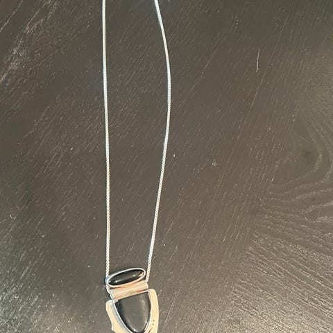 Sølvsmykke «Støv» i oksidert sort sølv av gullsmed Dreng Helle fra Rysstad. Fullstemplet med 925 DH og merket «STØV» på anhrnget. Se bilder. Alt er helt og pent, i god stand ! Sølvkjedet er 58 cm i omkrets og anhenget er ca 41x16 mm stort.