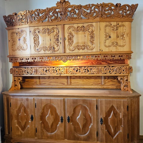 Skap med overdel i utskåret treverk. Møbelet har to skuffer øverst og skapdører med detaljerte treskjæringer i front. Overdelen har åpen hylleløsning og utskåret dekor langs topp og sider. Klokke i samme stil, fungerer helt fint.