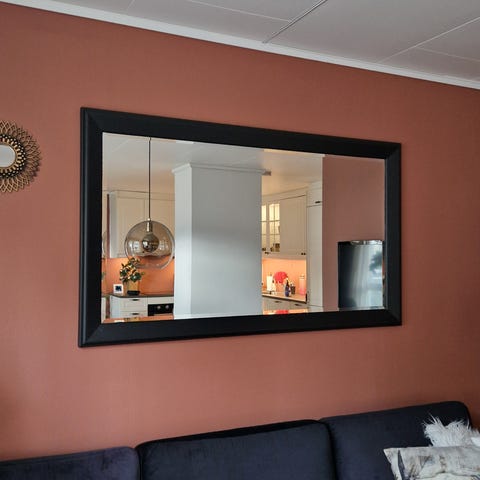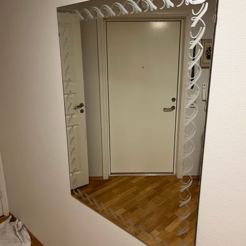 Stort speil i rektangulær form med ramme i eik. Rammen har en viss dybde som gir et markert uttrykk på veggen. Egner seg som helfigurspeil i gang, soverom eller andre rom der det er behov for et større speil. Speilet er lagd av en møbelsnekker, selve speilet har blitt limt på plass da det var litt løst i rammen. Mål: 180cm høy, 80cm bred og 3 cm dyp. Hentes i Ski.