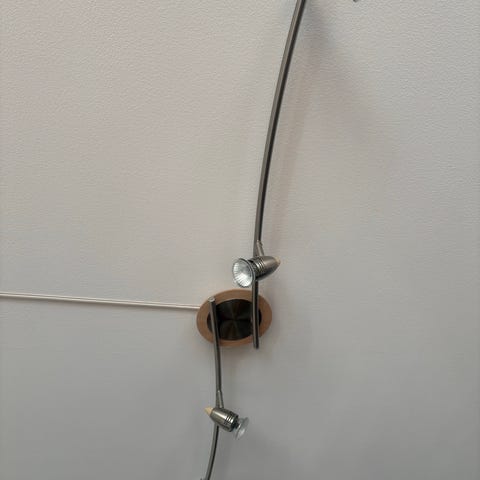 Selger en stilren taklampe med 4 justerbare spotter i børstet stål. Gir godt lys og passer fint i f.eks. stue, gang eller kjøkken.