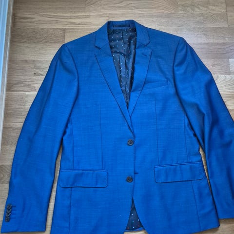 Jakken er grå og skjorten i str M er matchende turkis. Klassisk modell med jakkeslag, brystlomme og frontlommer. Diskré mønster i stoffet og karakteristiske Moods of Norway-detaljer.