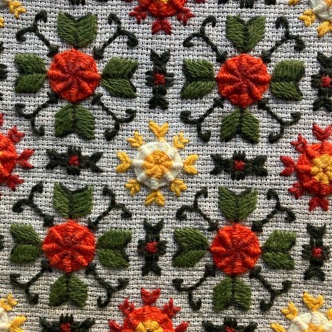 håndbrodert - håndarbeid - broderi - husflid - håndsøm - håndsydd - rød - gul - vintage - retro - dekorativ - blomster - tekstilkunst - folkekunst - kunsthåndverk